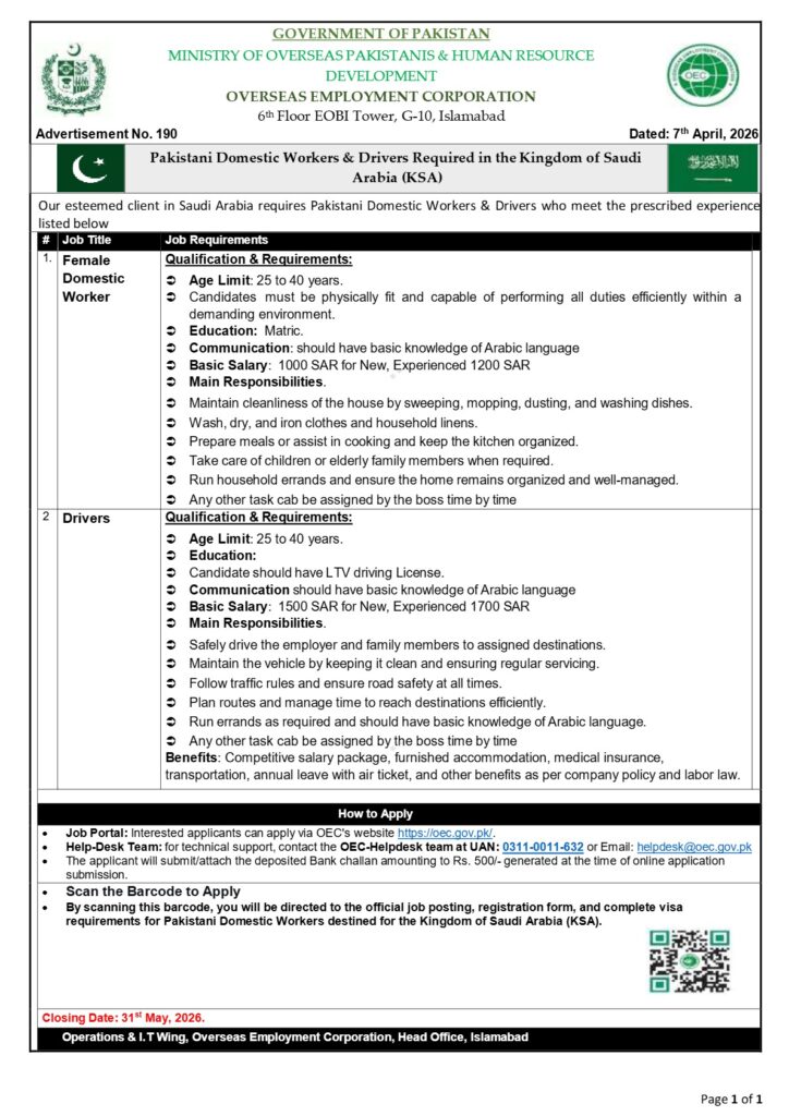 The Overseas Employment Corporation (OEC) has officially announced new job openings for Pakistanis looking to work in Saudi Arabia. This is a government-backed recruitment drive, ensuring a 100% secure and transparent process for both male and female candidates. If you want to build a stable career abroad with legal protection, this is your chance.